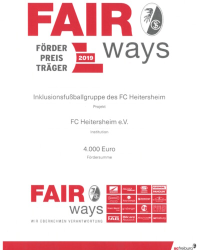 Am 3. August 2019 wurde der „Fairways-Publikumspreis 2019“ des SC Freiburg vergeben. Unter den drei Kandidaten befand sich auch die IfG des FC Heitersheim. Zur Freude des Übungsleiters Patrick Moran und Jugendleiters „Gallus“ wurde der 1. Preis an die IFG vergeben mit damit verbundenen 4000 €(!) Fördergeld. Nach der Scheckübergabe im Schwarzwaldstadion wurde auf den Anzeigetafeln im Schwarzwaldstadion vor vielen Zuschauern nochmals der Bewerbungsfilm gezeigt. Was für eine tolle Werbung für den FC Heitersheim!
